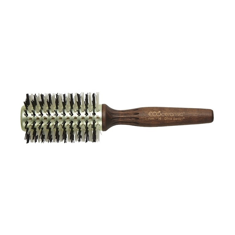 Термобрашинг Olivia Garden EcoСeramic Firm Thermal для укладання волосся з керамічним покриттям і фірмовими щетинками, за рахунок чого процес укладення стає швидшим і результативним. Оснащений міцною дерев'яною ручкою ручної роботи з унікальним антиковзаючим покриттям. Підходить для витягування і випрямлення товстого, грубого волосся, додання об'єму і м'яких завитків.